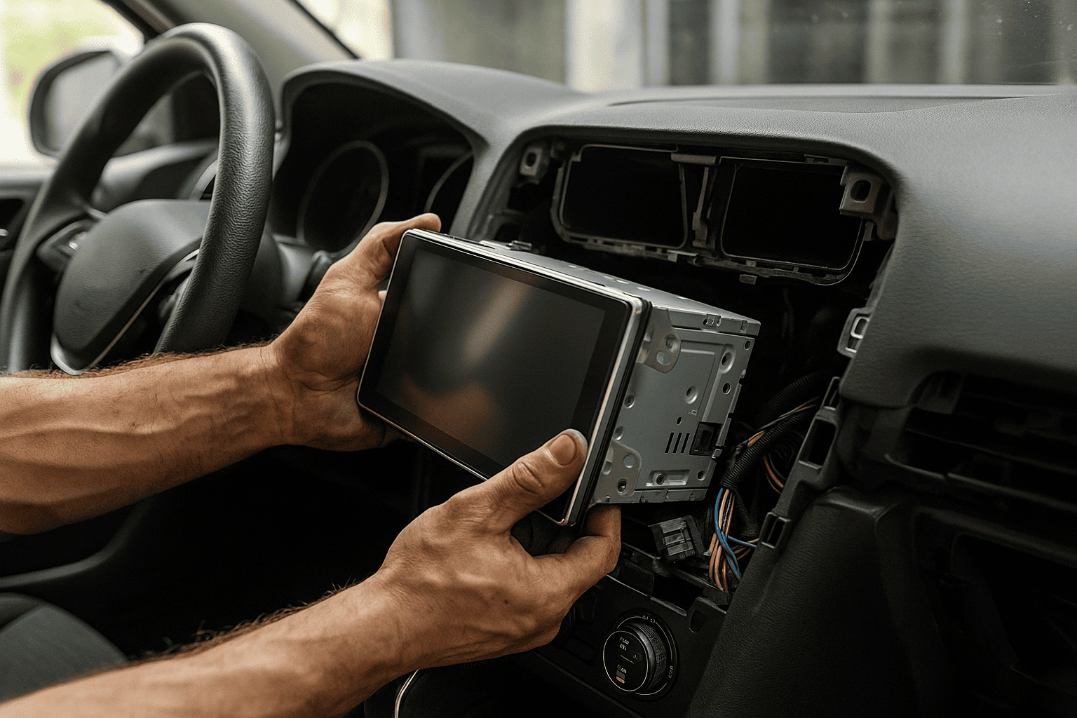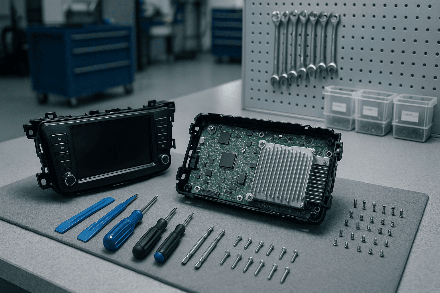 Аккуратно, с помощью профессионального инструмента извлекаем мультимедийный блок из панели автомобиля, избегая малейших повреждений окружающих элементов салона. На чистом верстаке производится бережная разборка корпуса устройства. Этот этап требует ювелирной точности, чтобы не повредить хрупкие внутренние компоненты и лицевую панель с кнопками.