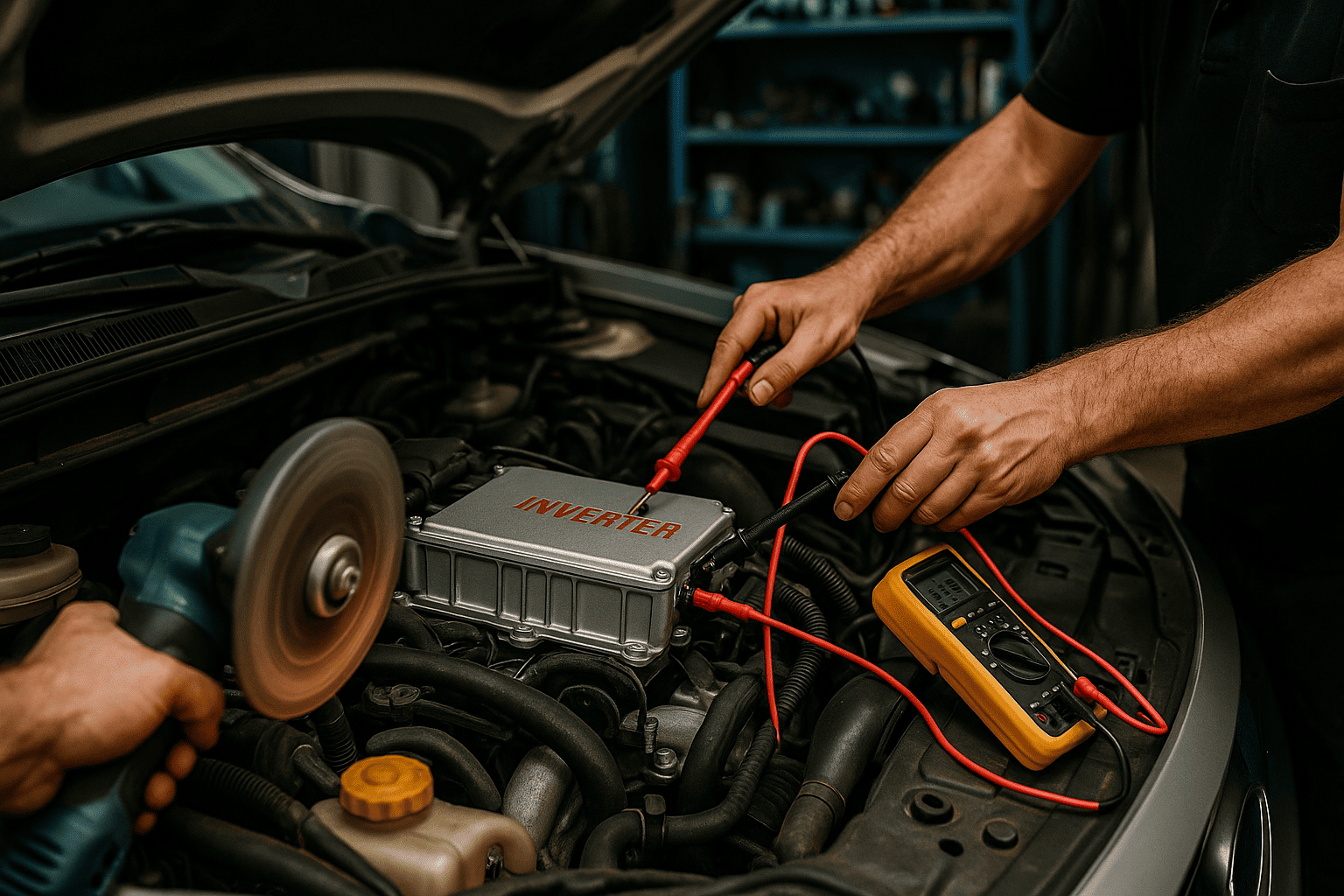 На этом этапе инвертор аккуратно интегрируется в электроцепь автомобиля в соответствии с техническим регламентом. Мастер обеспечивает надежное соединение клемм, правильную прокладку кабелей через технологические отверстия и их защиту от перетирания и нагрева. Все работы ведутся с соблюдением мер безопасности для исключения короткого замыкания.