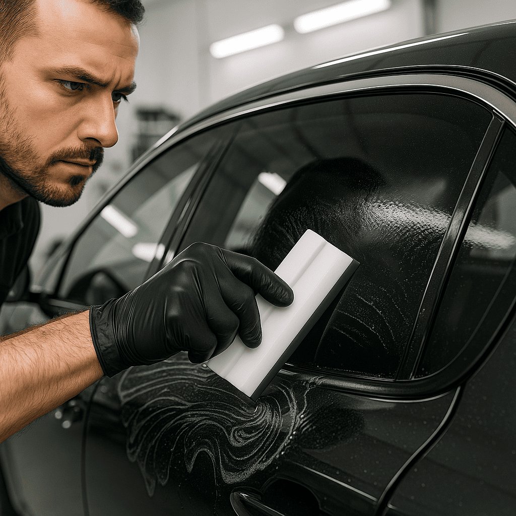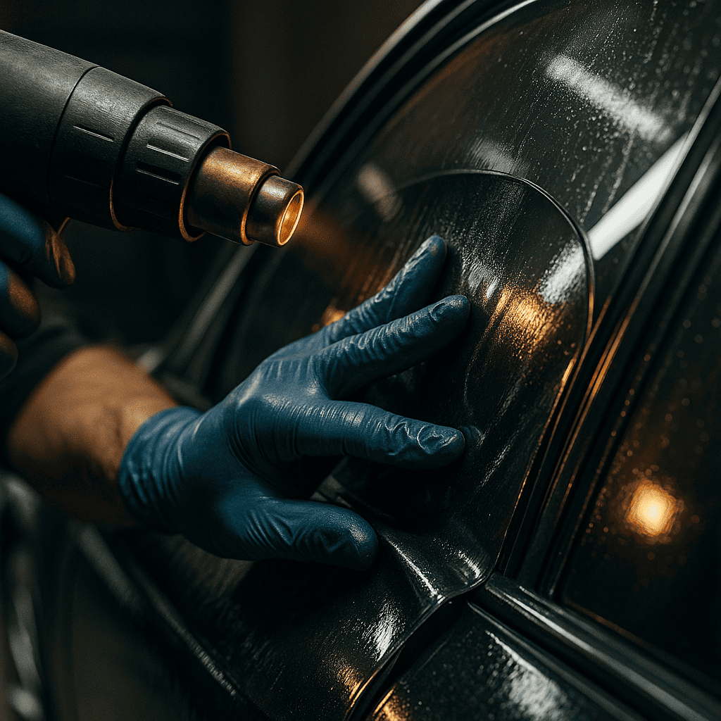 Мастер, используя мягкий ракель и специальную технику, наносит подготовленную пленку на внутреннюю поверхность стекла, выгоняя влагу и обеспечивая идеальное прилегание. Для закрепления результата швы и края прогреваются термофеном, что активирует клеевой слой и обеспечивает максимальную адгезию.