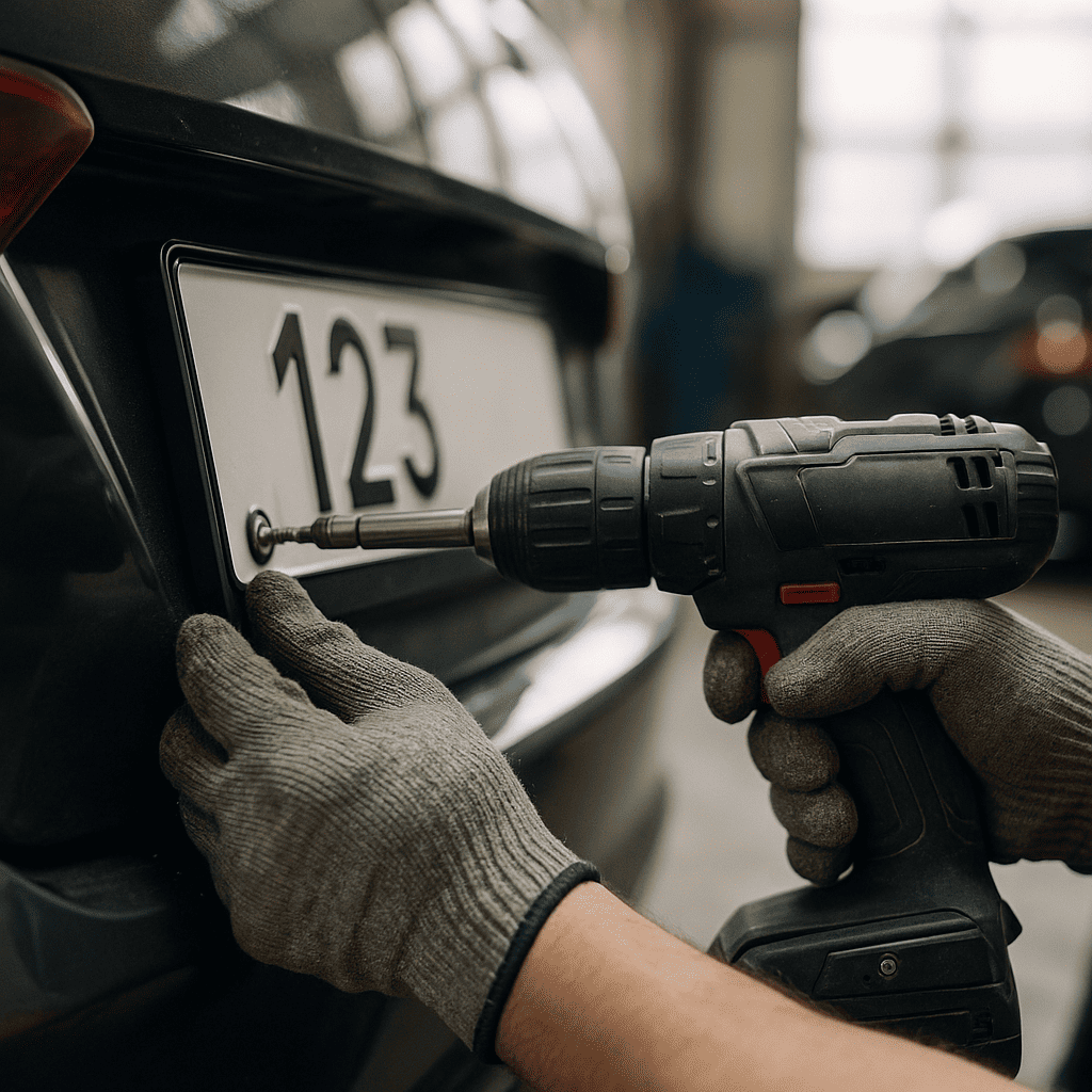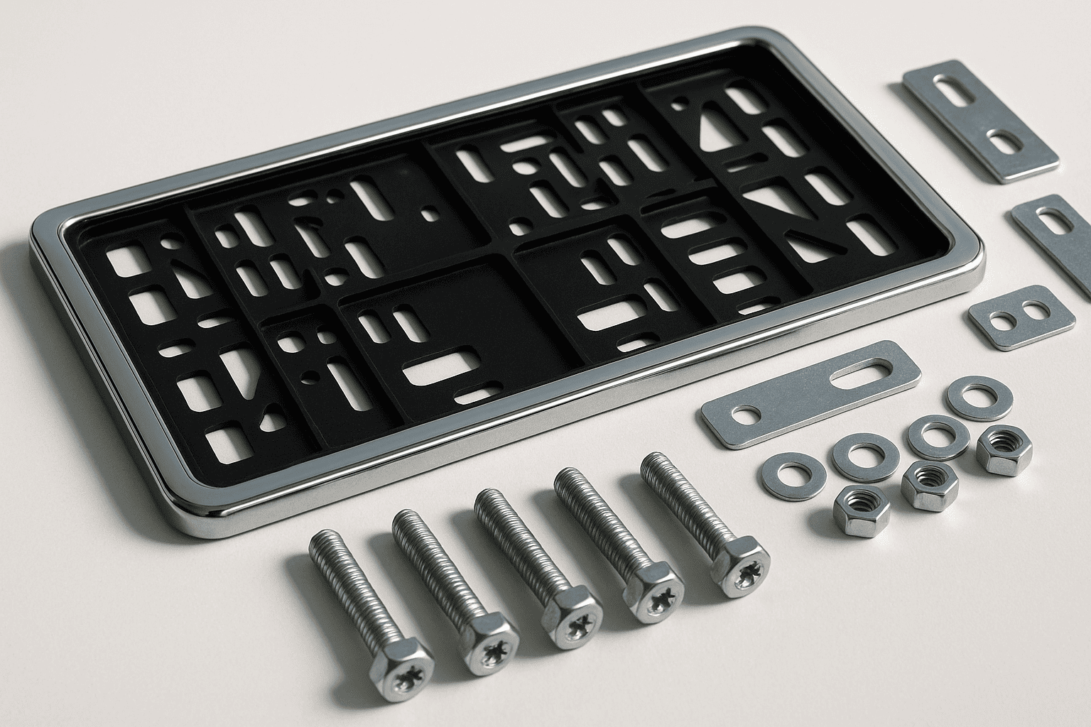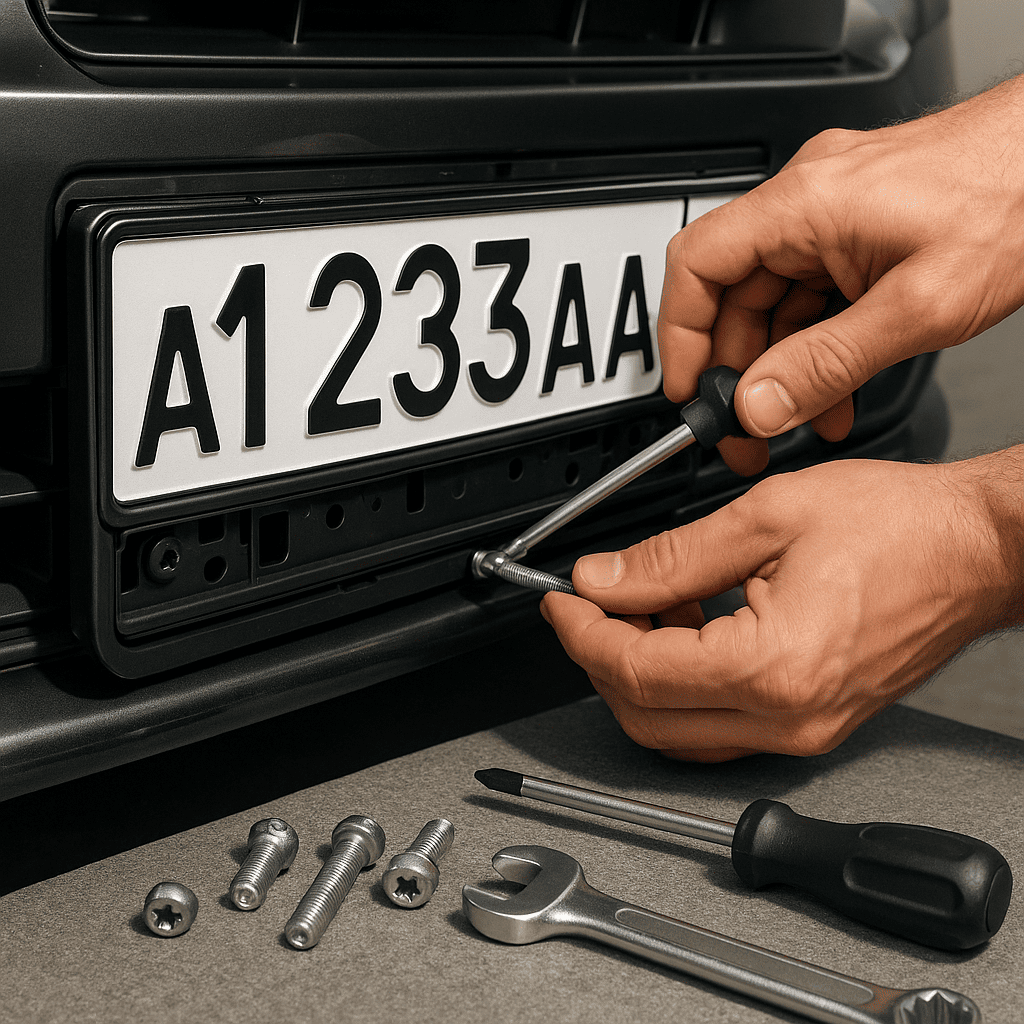 Π ΠΌΠ΅ΡΠ°Π»Π»ΠΈΡΠ΅ΡΠΊΡΡ ΡΠ°ΠΌΠΊΡ Π²ΡΡΠ°Π²Π»ΡΠ΅ΡΡΡ Π²Π°Ρ Π½ΠΎΠΌΠ΅ΡΠ½ΠΎΠΉ Π·Π½Π°ΠΊ. ΠΡΠ° ΠΊΠΎΠ½ΡΡΡΡΠΊΡΠΈΡ Π½Π°Π΄Π΅ΠΆΠ½ΠΎ ΡΠΈΠΊΡΠΈΡΡΠ΅ΡΡΡ Π½Π° ΡΠΆΠ΅ ΡΡΡΠ°Π½ΠΎΠ²Π»Π΅Π½Π½ΠΎΠΉ ΠΏΠ»Π°ΡΡΠΎΡΠΌΠ΅ Ρ ΠΏΠΎΠΌΠΎΡΡΡ Π²ΠΈΠ½ΡΠΎΠ² Ρ Π·Π°ΡΠΈΡΠΎΠΉ ΠΎΡ ΠΏΡΠΎΠΈΠ·Π²ΠΎΠ»ΡΠ½ΠΎΠ³ΠΎ ΠΎΡΠΊΡΡΡΠΈΠ²Π°Π½ΠΈΡ (Β«ΡΠ΅ΠΊΡΠ΅ΡΠΎΠΊΒ»). ΠΡ ΠΈΡΠΏΠΎΠ»ΡΠ·ΡΠ΅ΠΌ ΡΠ΅Π·ΠΈΠ½ΠΎΠ²ΡΠ΅ ΠΏΡΠΎΡΡΠ°Π²ΠΊΠΈ, ΡΡΠΎΠ±Ρ ΠΈΠ·Π±Π΅ΠΆΠ°ΡΡ Π²ΠΈΠ±ΡΠ°ΡΠΈΠΉ ΠΈ Π΄ΡΠ΅Π±Π΅Π·ΠΆΠ°Π½ΠΈΡ Π²ΠΎ Π²ΡΠ΅ΠΌΡ Π΄Π²ΠΈΠΆΠ΅Π½ΠΈΡ, ΠΎΠ±Π΅ΡΠΏΠ΅ΡΠΈΠ²Π°Ρ ΠΏΠΎΠ»Π½ΡΡ ΡΠΈΡΠΈΠ½Ρ.