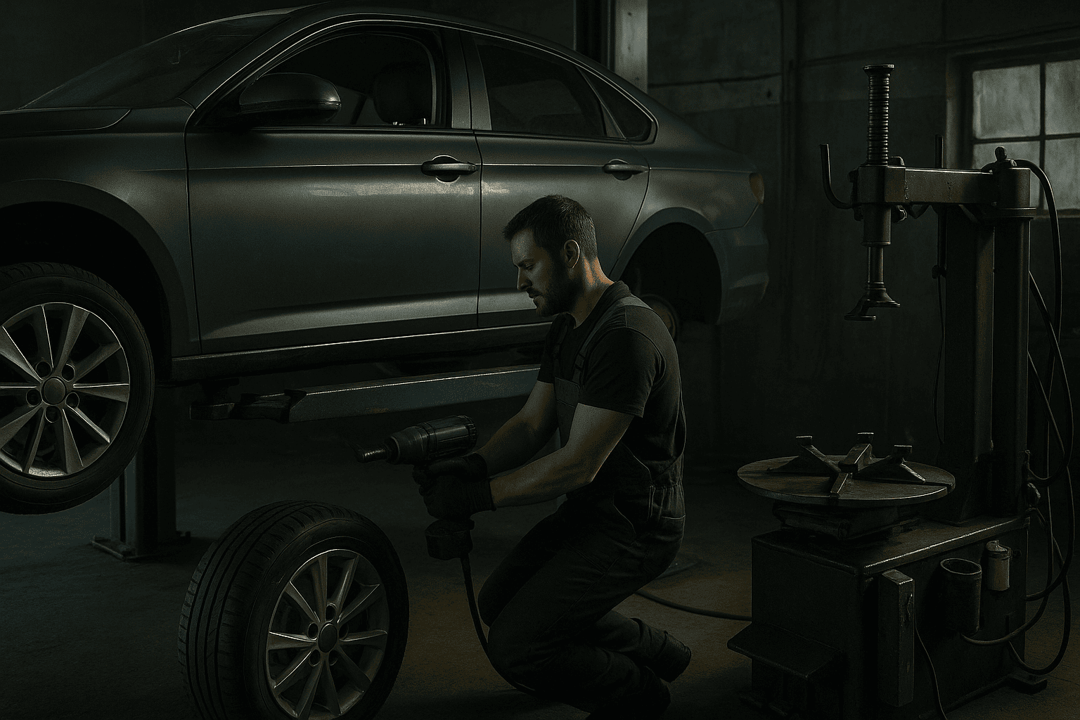 Аккуратно, с использованием профессионального шиномонтажного оборудования, колеса снимаются с автомобиля. Мастер подготавливает чистую площадку для монтажа металлических вентилей со встроенными датчиками.