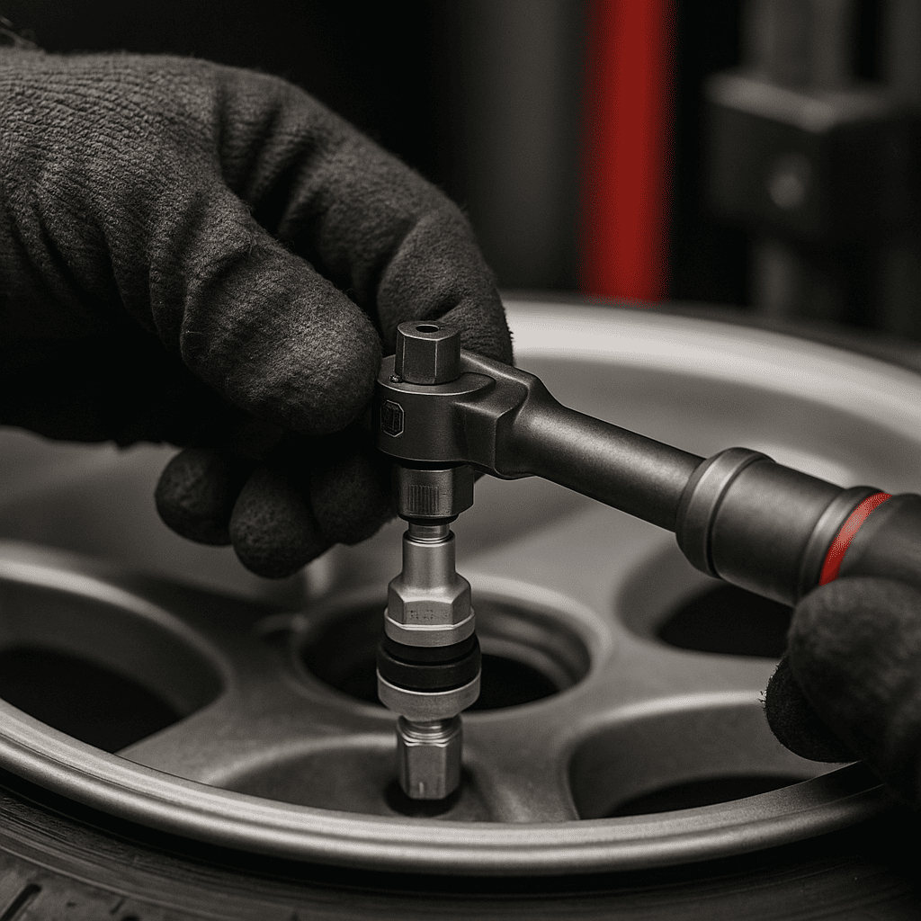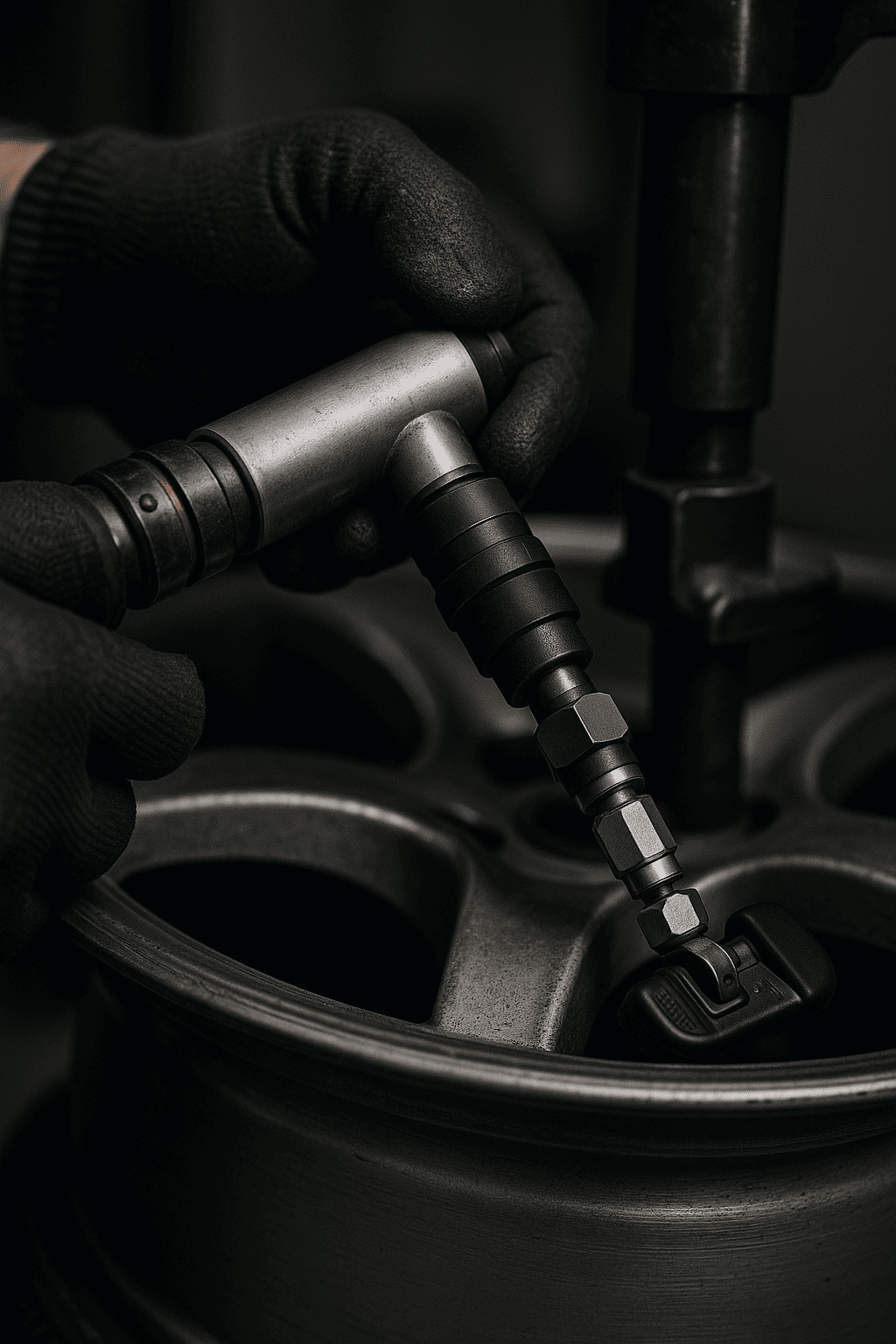 Вот оно — технологическое сердце процедуры. Новые металлические вентили с датчиками аккуратно устанавливаются на свои места на специальные герметизирующие уплотнители. После этого колесо собирается и накачивается, мастер тщательно проверяет на предмет возможных утечек воздуха.