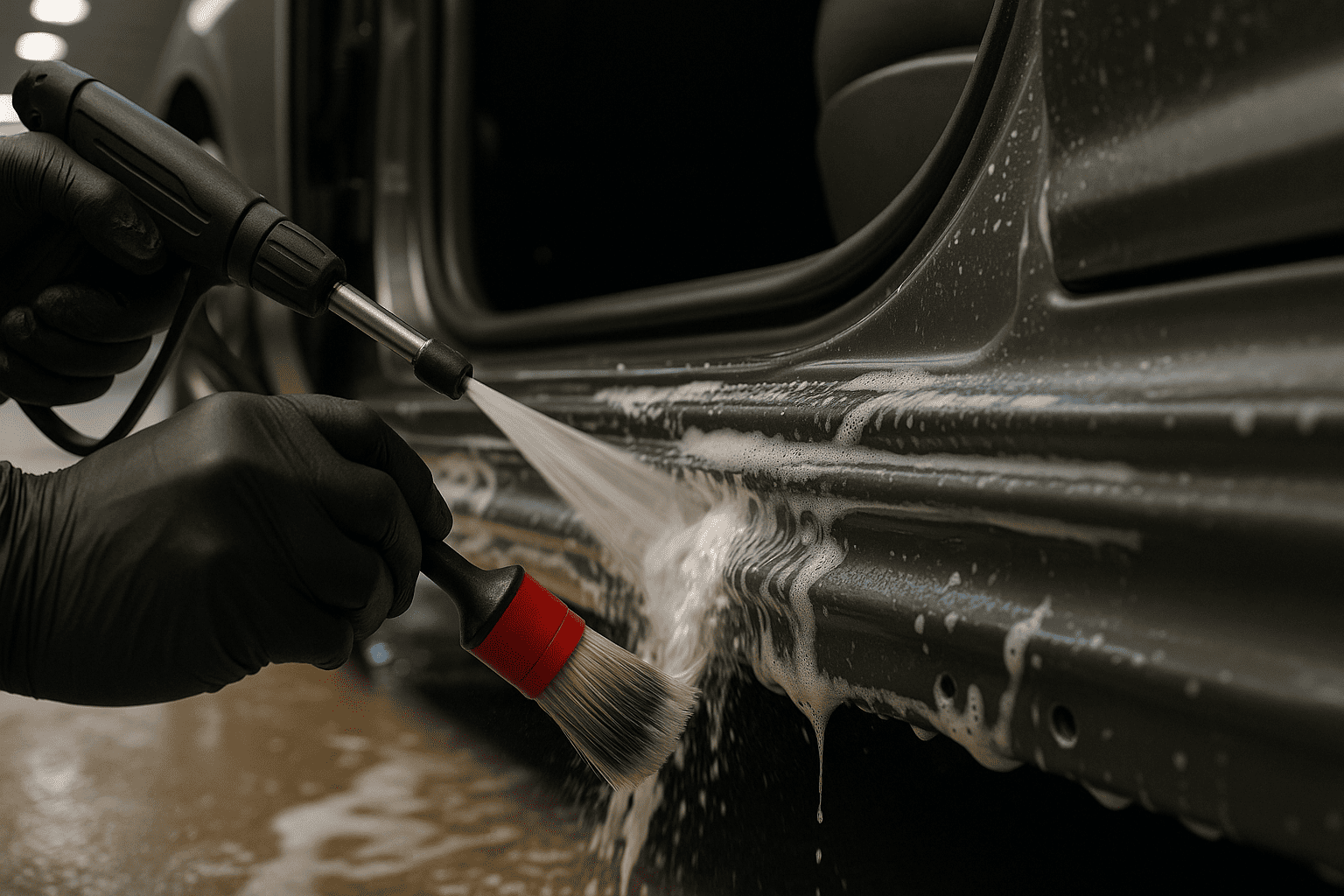 Места будущего монтажа тщательно моются и обезжириваются. Мы уделяем особое внимание стыкам и скрытым полостям, куда может попасть грязь. Чистая поверхность — гарантия того, что порог будет установлен идеально ровно и надежно закреплен, без перекосов и зазоров. Это важный этап для будущей долговечности.
