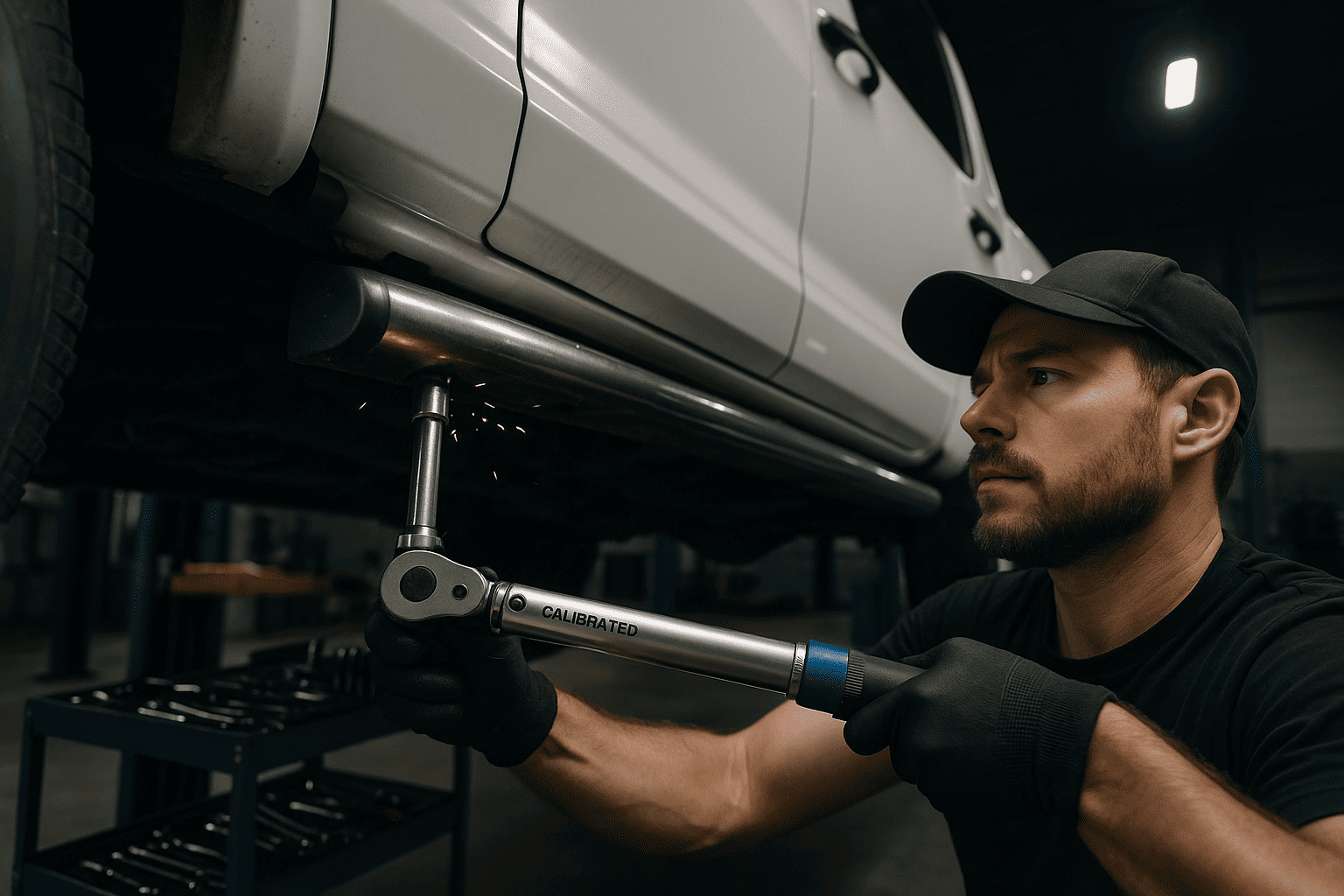 Пороги фиксируются на штатные места крепления с помощью специального инструмента, обеспечивающего точный момент затяжки. Если требуется, используются дополнительные кронштейны или профессиональный герметик для защиты от коррозии и влаги. Все работы ведутся аккуратно, без повреждения лакокрасочного покрытия и элементов кузова.